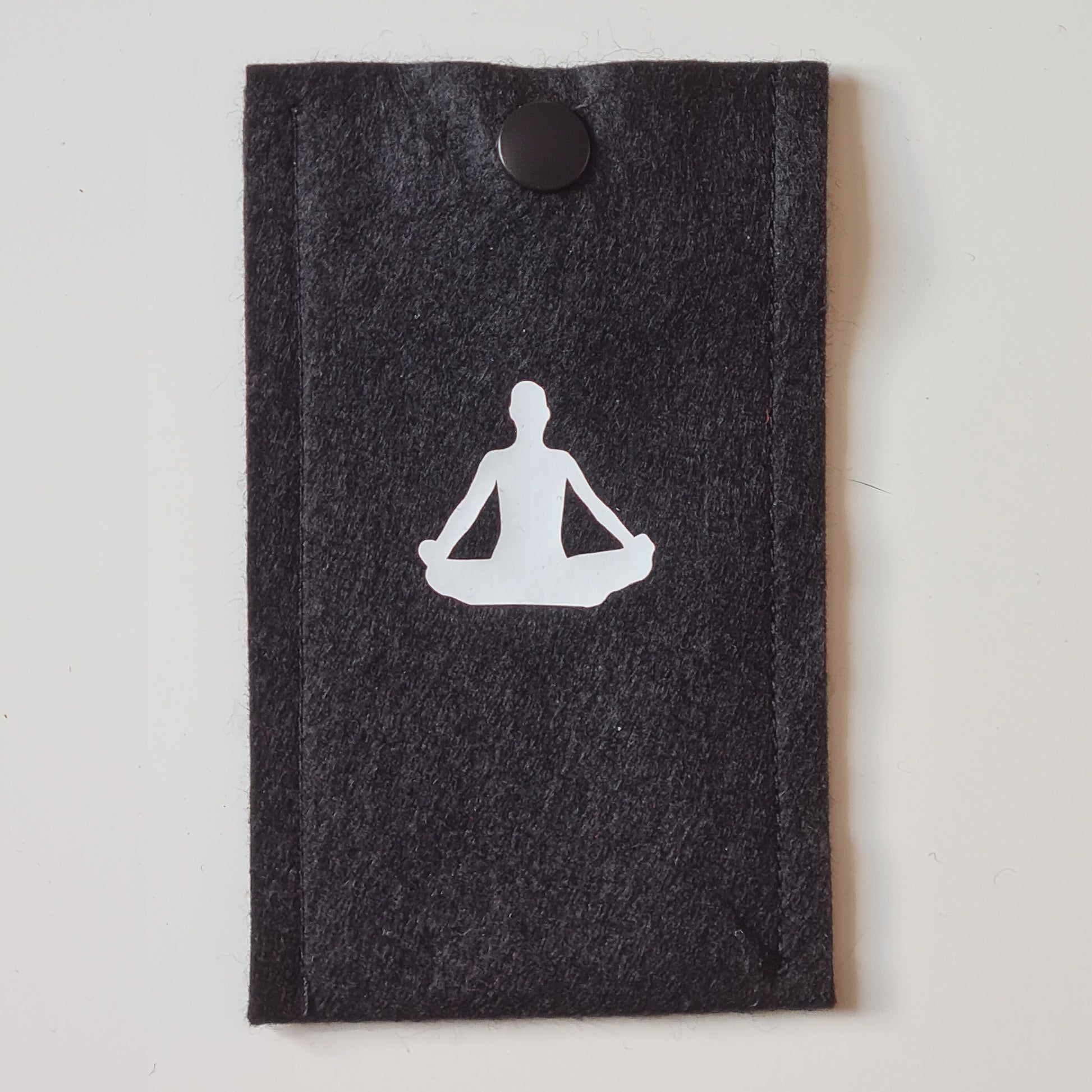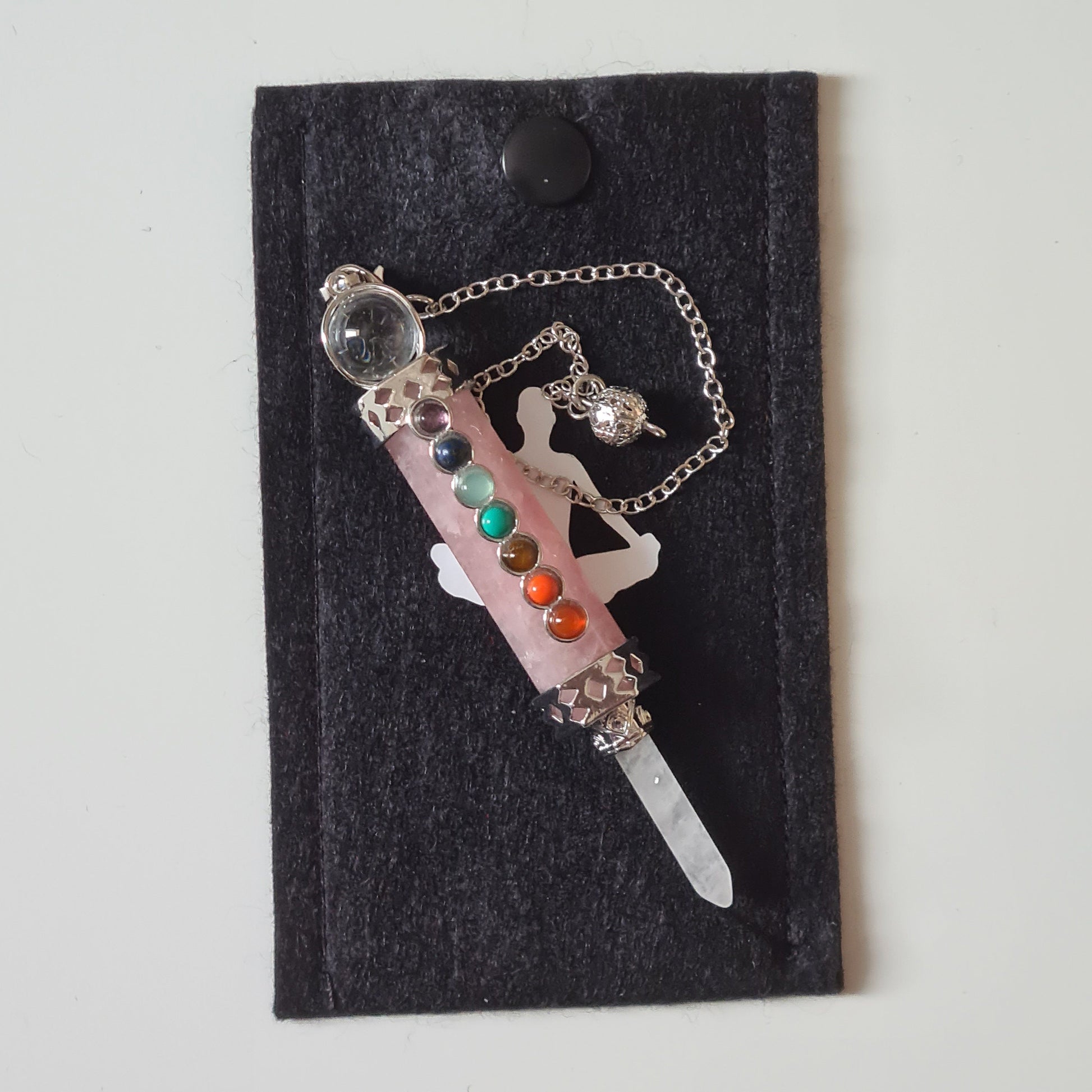 The pendulum comes with a pouch in black felt with a meditating figure in white, made by Pagan Art.