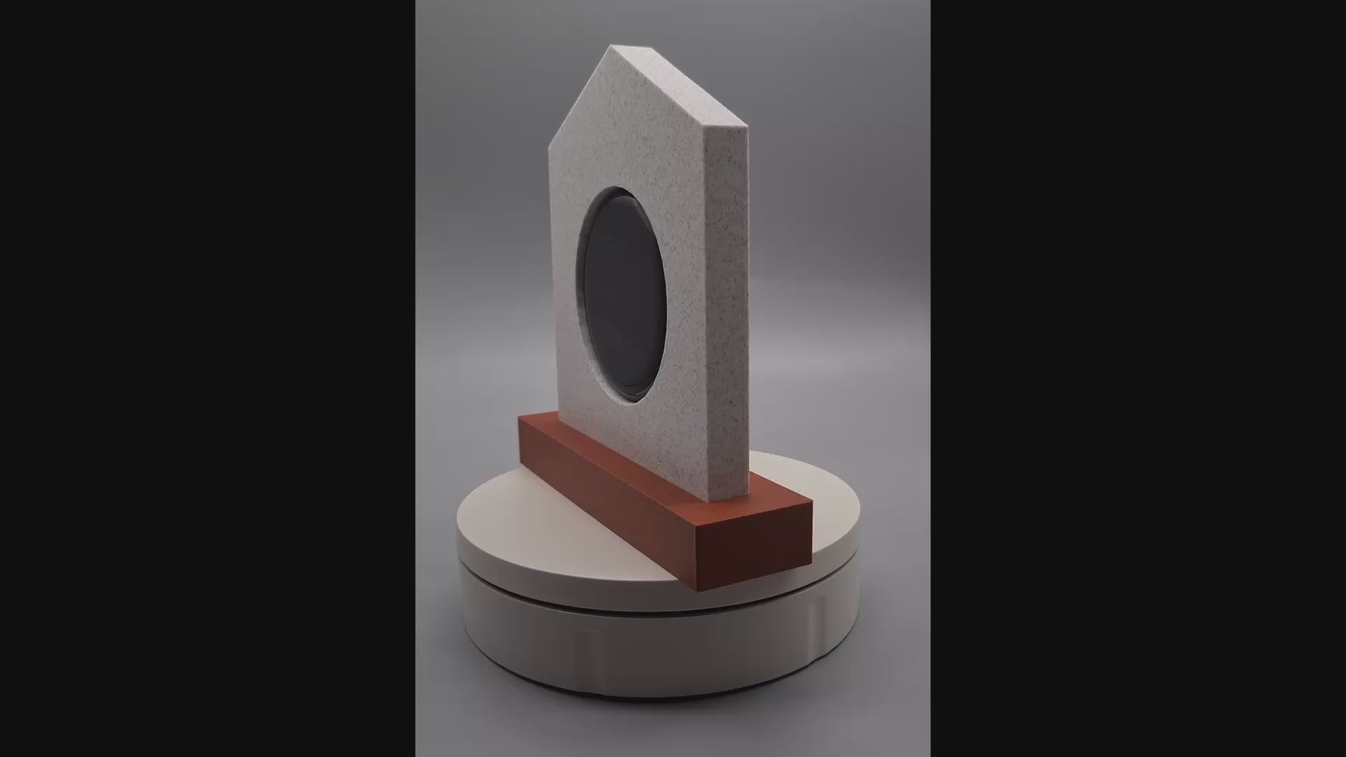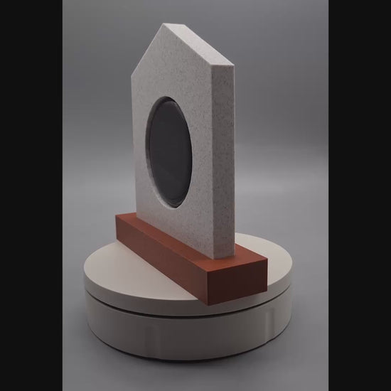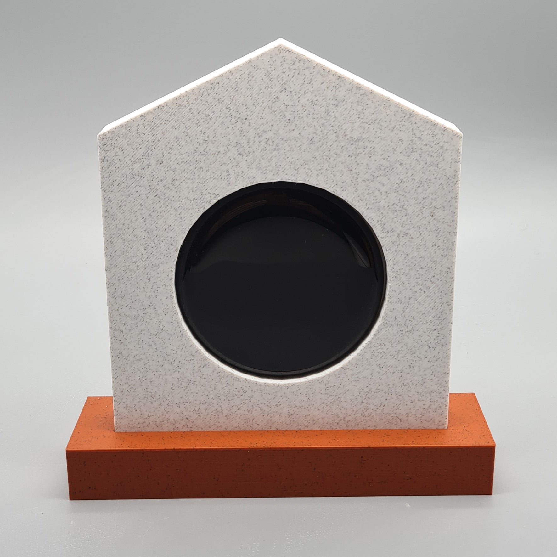 The mirror is fused glass set into a marble effect 3d printed display with stand.